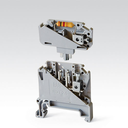 ترمينال با اجزاء الکترونيکی و قطع شونده قابل استفاده جهت سيستمهای اندازه گيری و کنترل می باشند. در ترمينالهای نوع قطع شونده با قطع سريع و ايمن جريان، تست و نگهداری سيستم می تواند انجام پذيرد. عملکرد سريع ترمينال RDT4 در سوئيچينگ سريع مدارات، همچنين وجود تست سوکت در نوع RDT4-TS جهت اندازه گيری، تست و مونيتورينگ مدارات، اين تايپ از ترمينالها را متمايز ساخته است. علاوه بر وظيفه ی سوئيچينگ، ترمينال RDT2.5-C به همراه متعلقات، به عنوان ترمينال ديودی (RDT2.5-CDC) و يا ترمينال فيوزی (RDT2.5-CFC همراه با LED و يا بدون LED ) استفاده می شوند. ترمينالهای قطع شونده شرکت توليدی رعد (RDT2.5-C و RDT4) قابليت جايگذاری هر گونه المان الکتريکی مانند مقاومت،خازن و … را دارا می باشند.